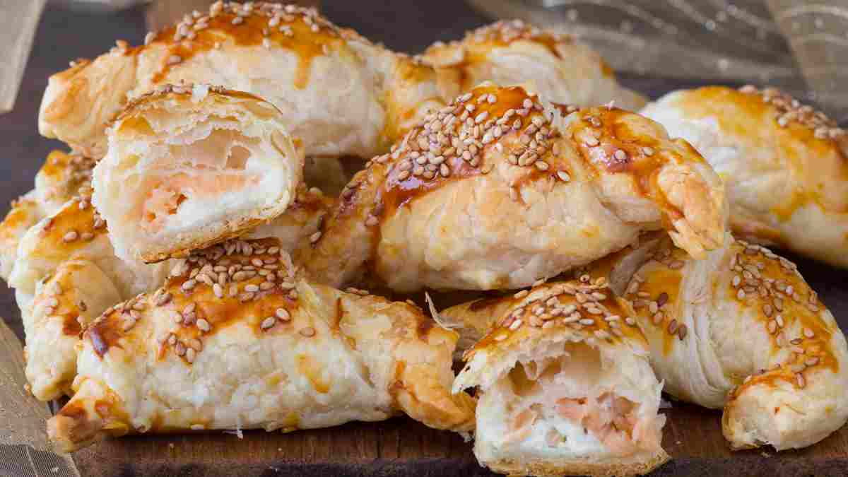 Découpez le saumon en petits morceaux et mélangez-le au fromage Philadelphie. Déposez un peu de mélange au centre de chaque cône de pâte. Enrouler chaque cône en partant du côté arrondi du cône et en terminant à l’extrémité. Fermez les extrémités et pliez le croissant pour lui donner la forme d’une demi-lune. Répétez pour les autres cônes.