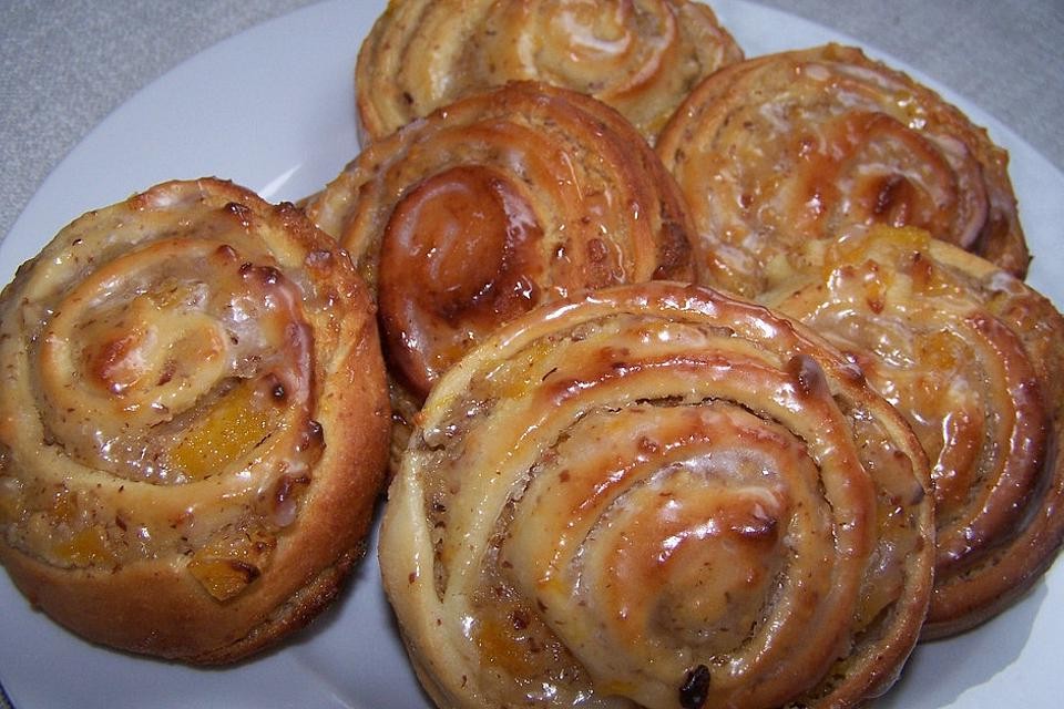 Abaisser la pâte levée en une grande feuille. Répartir uniformément la garniture et rouler la feuille en un gros rouleau.