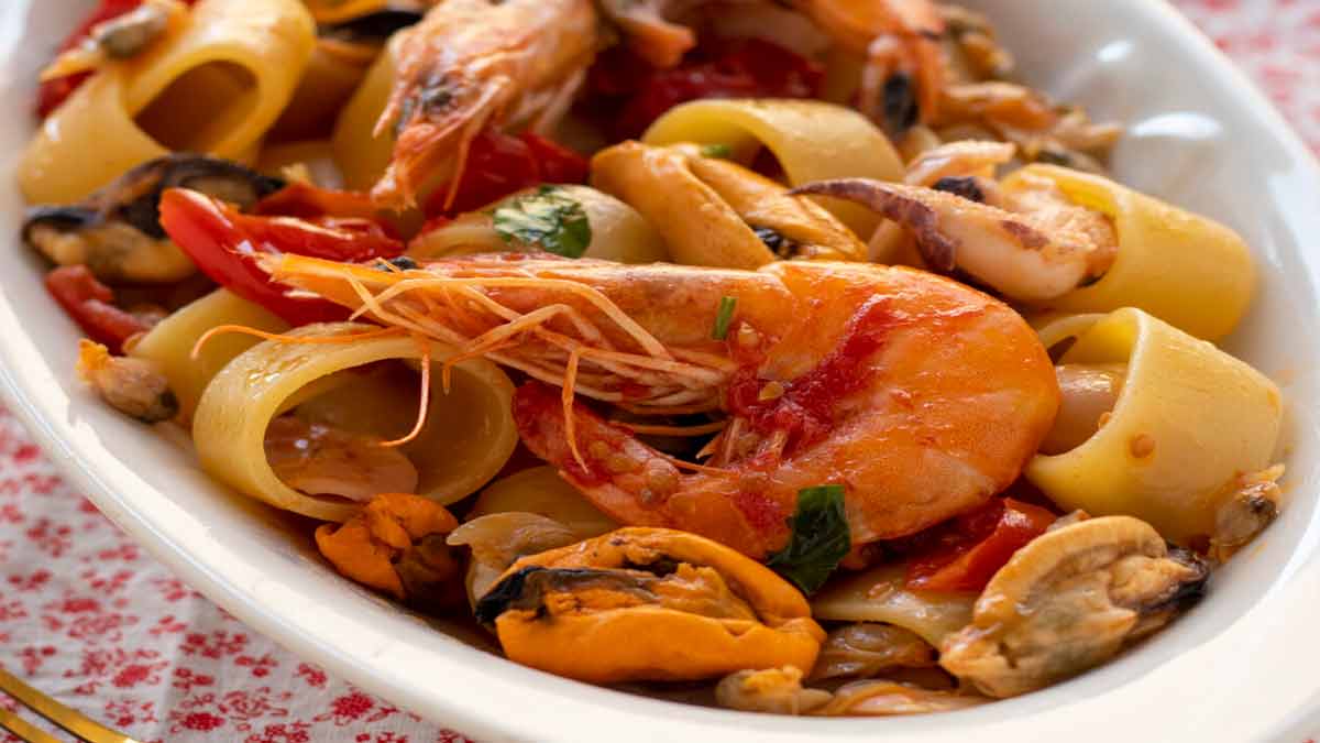 Verser la béchamel aux noix de Saint-Jacques, crevettes et champignons.