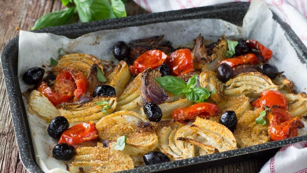 Fenouil gratiné au four à la méditerranéenne. Accompagnement tomates et olives