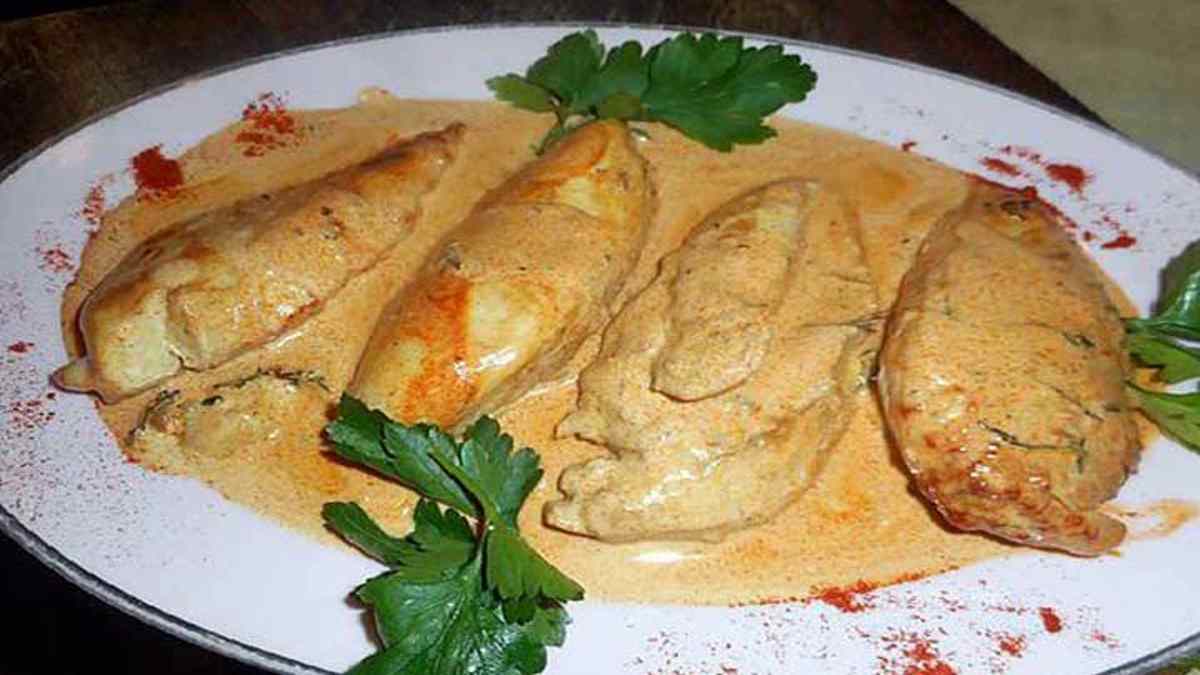 Baissez le feu a moyen, incorporez la crème fraîche, remettre les filets de poulet, laisser cuire 5 minutes. Dressez sur un plat de service, les filets de poulet nappés de sauce. Décorez enfin de pluches de persil plat.