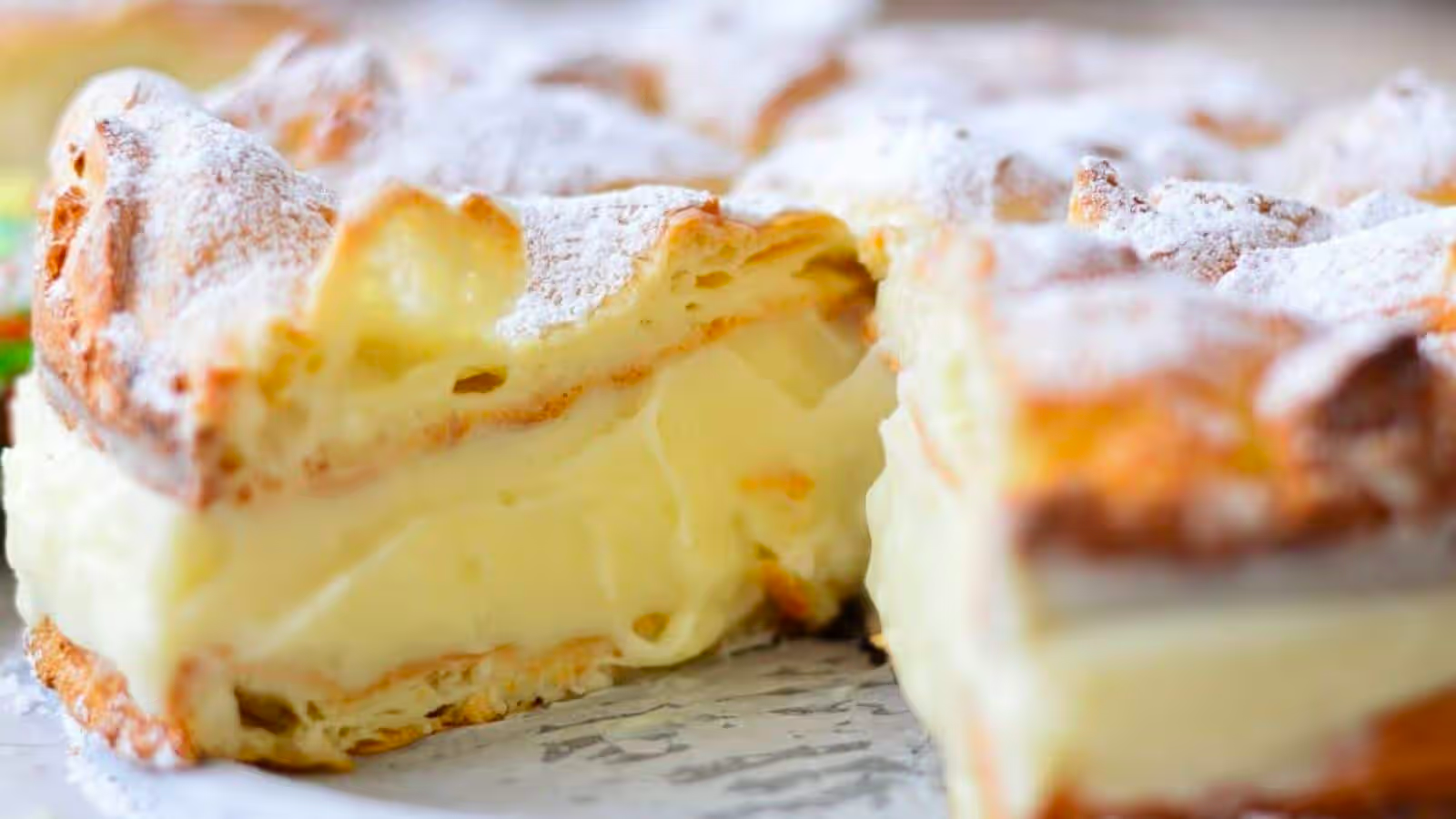 8. Assemblez le gâteau. Disposer sur un plat de service une première couche de pâte feuilletée, couvrez bien avec la crème et superposer la deuxième couche de pâte feuilletée.