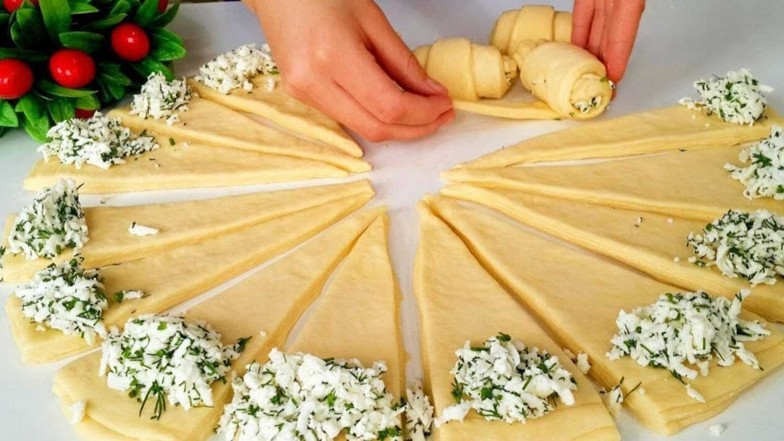 Étalez la pâte sur environ 3 cm d’épaisseur (env. 40 x 20 cm). Découpez 4 triangles. Placer la garniture au fromage sur la moitié inférieure des triangles, rouler fermement vers le haut, presser légèrement et plier en forme de croissant.