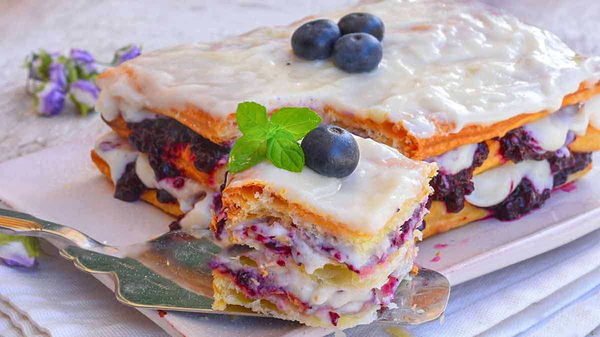Le millefeuille à la crème au lait et à la marmelade est à servir froid avec des myrtilles fraîches sur la pâte feuilletée superficielle avec un nappage au sucre glace.