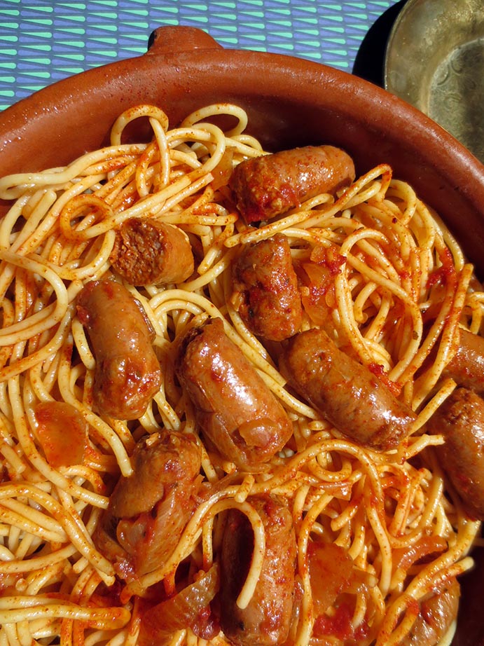 Faites cuire les pâtes dans de l’eau bouillante salée. Egouttez-les et incorporez à la sauce aux merguez.