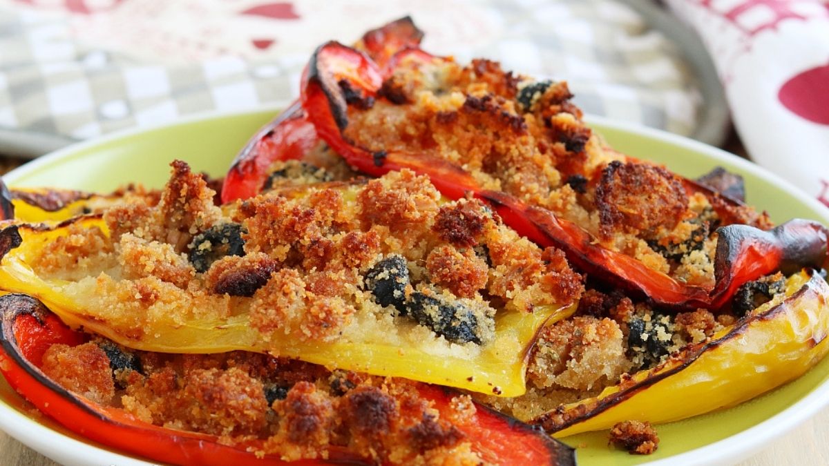 Poivrons gratinés au thon une recette très simple et savoureuse, parfaite comme accompagnement ou comme deuxième plat. Les poivrons sont assaisonnés avec une panure préparée avec de la chapelure, du thon bien égoutté, câpres, olives, origan et huile d’olive.