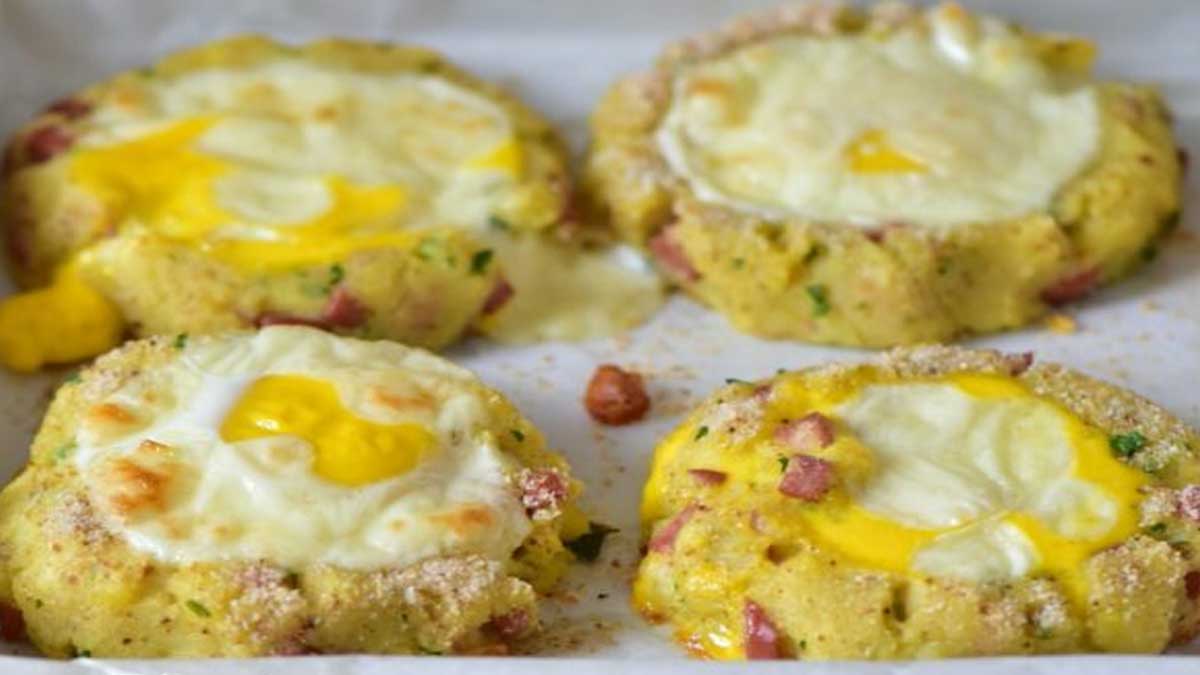 Puis, prendre un petit verre, creuser légèrement la surface et mettre sur la surface un peu de chapelure, des dés de mozzarella et un jaune d’œufs.