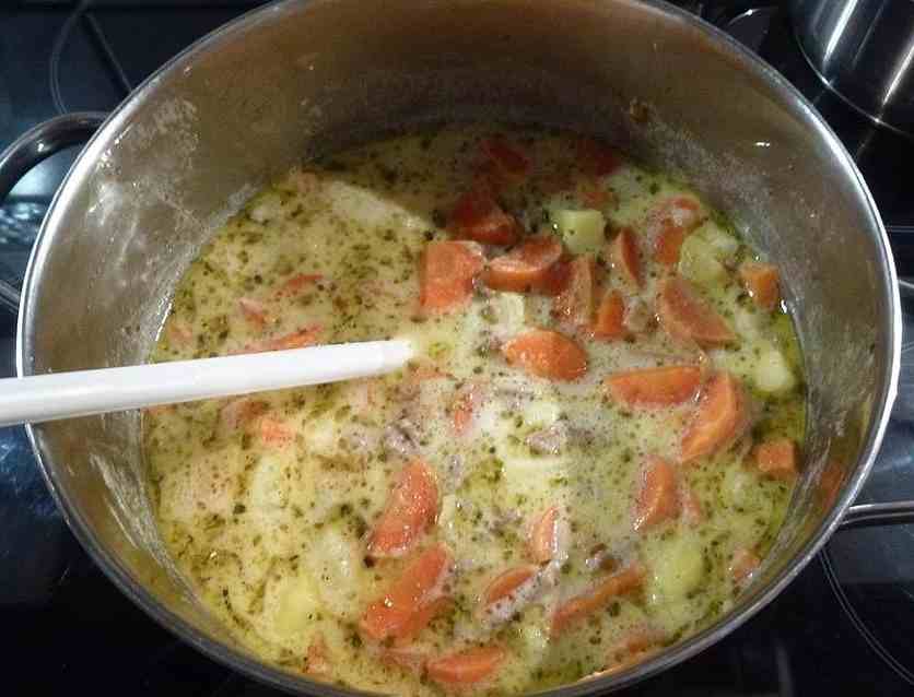 Lorsque les pommes de terre et les carottes sont cuites, égoutter et réserver la moitié du bouillon. Ajoutez ensuite le bœuf haché dans la casserole. Réserver au chaud à feu doux et mélanger le tout. Incorporer ensuite la crème sure.