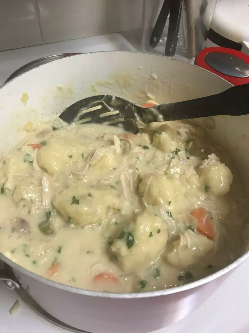Mettez-y le poulet. Ensuite, mélangez le lait et la farine à l’aide d’un fouet et versez-les sur le mélange de poulet dans la casserole.