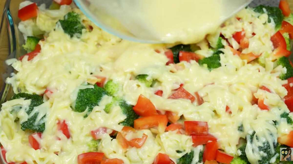 – Battez les œufs avec une pincée de sel dans un bol propre à l’aide d’un fouet à main, ajoutez 1 cuillère à soupe d’huile d’olive extra vierge et la farine, mélangez bien, ajoutez le lait, remuez, ajoutez le fromage râpé et versez le mélange sur vos légumes.