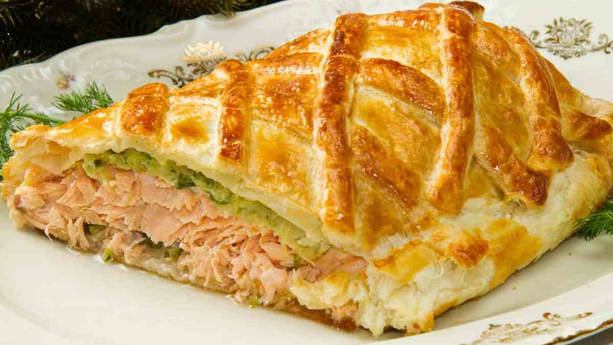 Ouvrir le premier rouleau de pâte feuilletée et le percer. Étalez le filet de saumon en petits morceaux au centre, à environ 2,5 cm du bord, puis farcissez-le avec un mélange de courgettes et de fromage à la crème. Ensuite, prenez un deuxième rouleau, percez-le, posez-le sur la garniture, scellez les bords et coupez l’excédent de tissu.