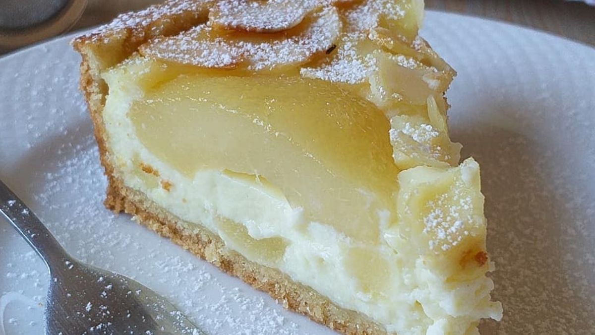 Tarte aux poires à la ricotta et aux amandes, une recette facile et délicieuse avec une base de pâte sablée et une garniture à la ricotta, poires et amandes.